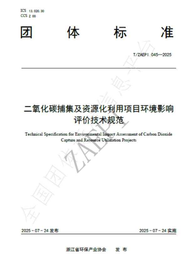 2025年7月24日,由浙江省環(huán)保集團生態(tài)環(huán)保研究院牽頭制定的《二氧化碳捕集及資源化利用項目環(huán)境影響評價技術(shù)規(guī)范》(T/ZAEPI 045-2025)團體標準正式發(fā)布并實施。該標準由浙江省環(huán)保產(chǎn)業(yè)協(xié)會歸口管理,聯(lián)合省內(nèi)多家環(huán)保領(lǐng)域骨干企業(yè)共同起草,填補了工業(yè)領(lǐng)域二氧化碳捕集及資源化利用項目環(huán)評技術(shù)規(guī)范的空白。